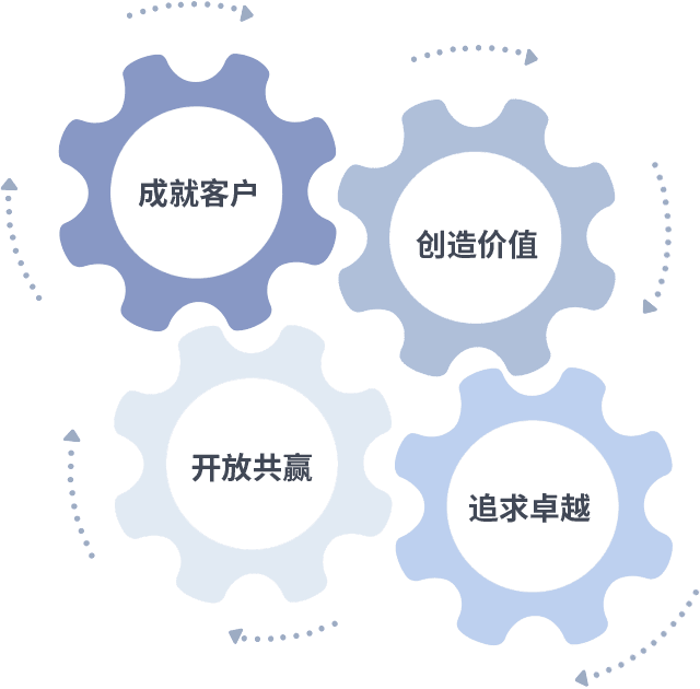 成就客户是一切决策的出发点,,创造价值是衡量所有工作的标准,,,追求卓越是我们做事做人的态度,,,开放共赢是我们的格局也是最终的结果。。价值观的齿轮环环相扣,,,,推动着组织里的每个人不断向前。。。
